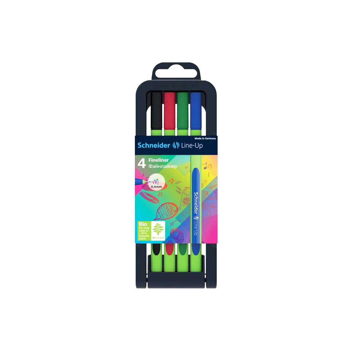 The Schneider Line-Up is the first fineliner with a barrel consisting of 88% bio-based plastic and recipient of the world's best-known eco-label "Blue Angel" for resource-saving and environmentally friendly production. Relaxed writing is ensured with the rubberized, ergonomic triangular barrel. Metal-encased, stainless steel writing tip suitable is for use with rulers and templates and writes in an approximate line width of 0.4 mm. The cap-off ink does not run dry even if the cap is removed for 2-3 days (except neon colors). With its wide range of colors and slim design it is a perfect companion for putting drawing and writing in the spotlight. The Line-Up is produced CO2 neutral. Includes convenient adjustable case stand with four (4) fineliners: Sapphire-Black, Romantic-Red, Blackforest-Green, Lapis-Blue.