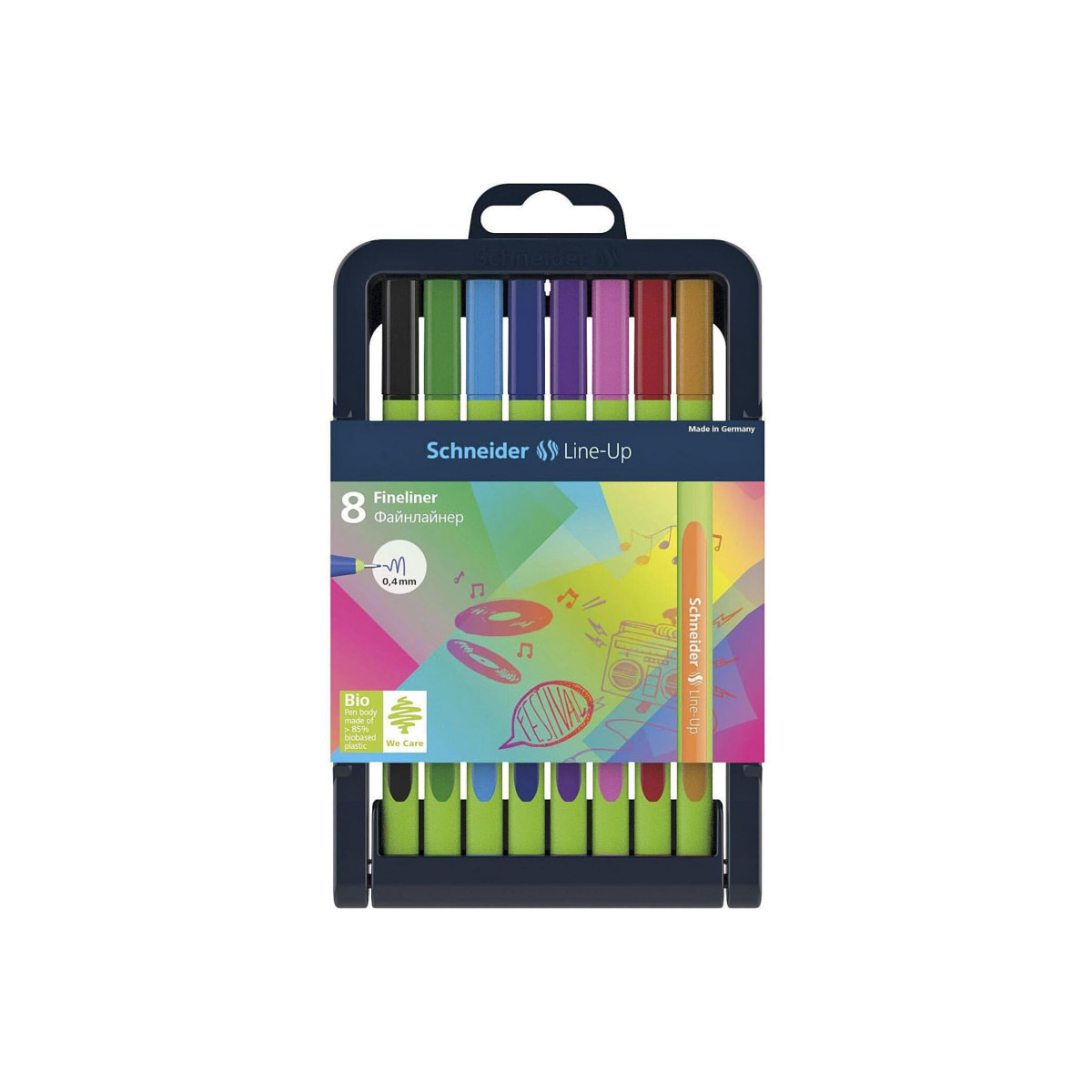 The Schneider Line-Up is the first fineliner with a barrel consisting of 88% bio-based plastic and recipient of the world's best-known eco-label "Blue Angel" for resource-saving and environmentally friendly production. Relaxed writing is ensured with the rubberized, ergonomic triangular barrel. Metal-encased, stainless steel writing tip suitable is for use with rulers and templates and writes in an approximate line width of 0.4 mm. The cap-off ink does not run dry even if the cap is removed for 2-3 days (except neon colors). With its wide range of colors and slim design it is a perfect companion for putting drawing and writing in the spotlight. The Line-Up is produced CO2 neutral. Includes convenient adjustable case stand with eight (8) fineliners: Sapphire-Black, Blackforest-Green, Mineral-Blue, Lapis-Blue; Daytona-Violet, Fashion-Pink, Romantic-Red, Tango-Orange.