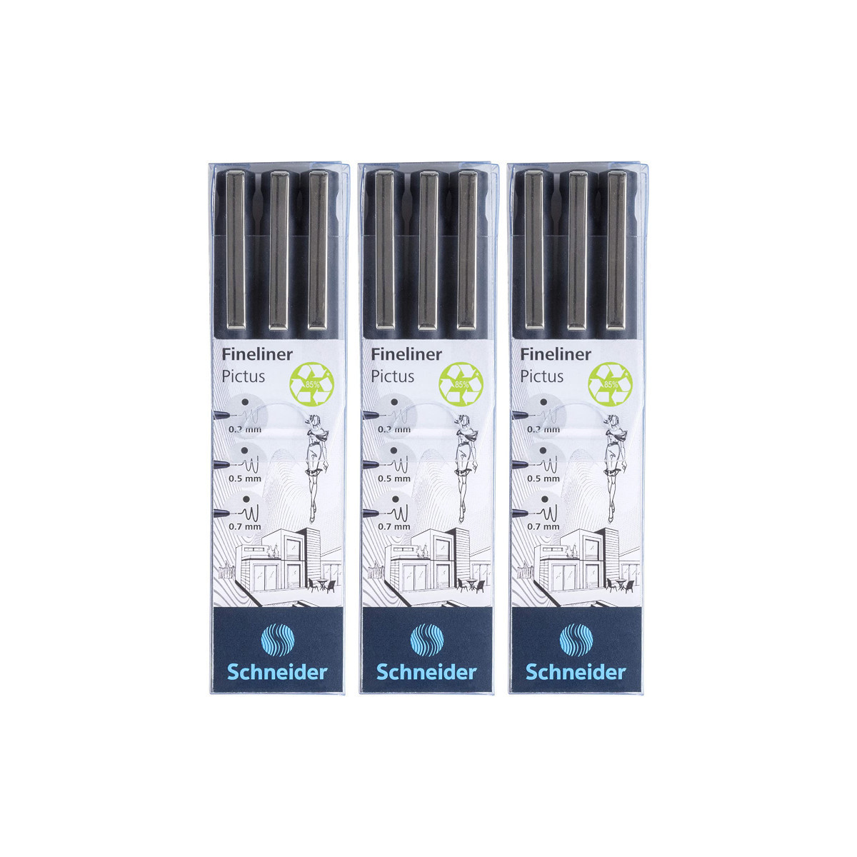 Technical illustrations or simply for sketching and writing at home or at school, the new fineliner Pictus qualifies for all these applications. Its water based, pigmented ink guarantees long lasting bright colors and an excellent resistance to fading. The ink is waterproof according to ink standard ISO 14145-2. Its metal encased writing tip stands for durability and precise layouts. Pictus is the ideal writing instrument for drawing, sketching, illustrating and writing as well as for working with rulers and stencils. At Schneider sustainability is one of the main priorities thus the pen body of the fineliner Pictus is made of at least 85% recycled plastics. Pictus, a real all-rounder. Each pack includes 3 Pictus Fineliners, one 0.3mm, one 0.5mm, and one 0.7mm. Sold as 3 packs for a total of 9 Pictus Fineliners.