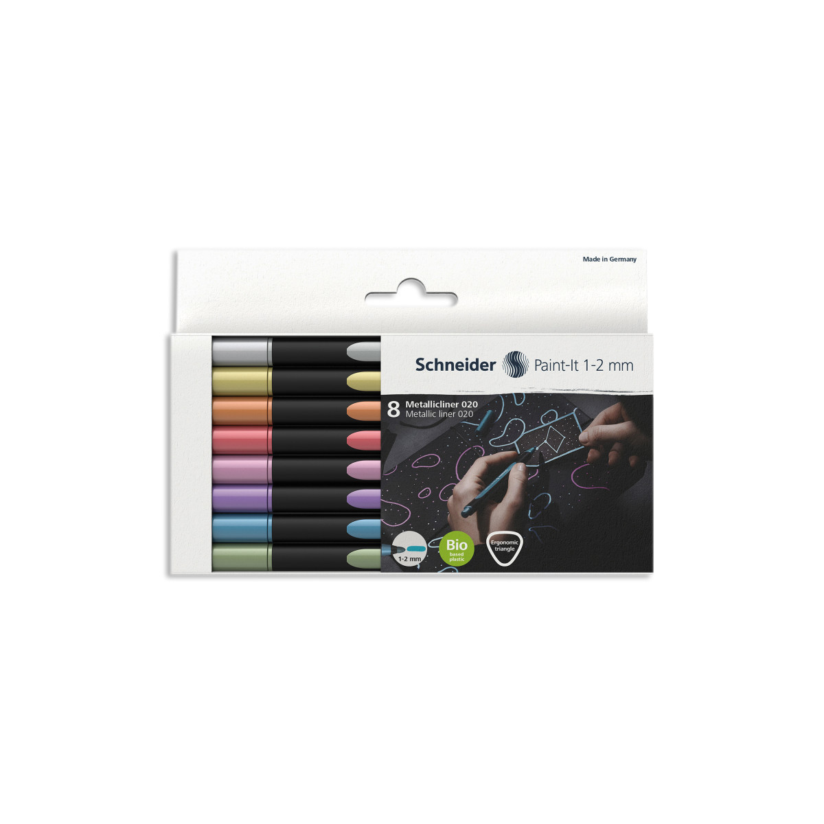The Schneider Paint-It 020 Metallic Liners feature high-quality, high-opacity metallic ink without the bleed-through for an eye-catching effect. Impressive results especially on smooth and non-absorbent surfaces. Ideal for DIY projects such as: handlettering, greeting cards, invitations, scrapbooking and more. Line width approximately 1-2 mm. Metallic ink color assortment in a wallet of eight (8) includes one each of: Silver, Gold, Copper, Vintage Red, Rose, Frosted Violet, Polar Blue, and Vintage Green Metallic. The cap color and name on the side of the barrel indicates ink color. Ink is fast-drying and low odor. No pumping and shaking necessary - just take off the cap and start working. Pen body is made of 88% bio-based plastic.