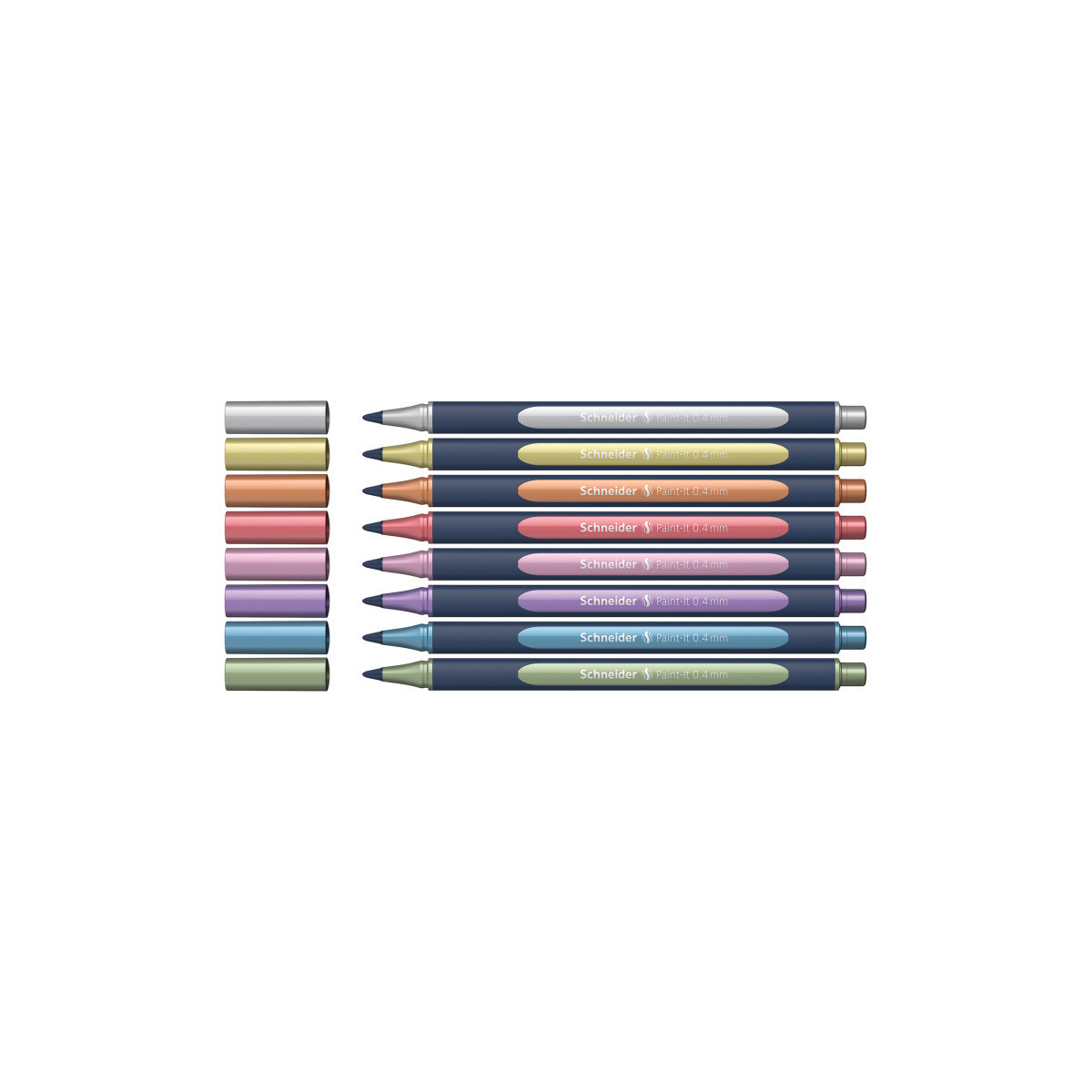 The Schneider Paint-It 050 Metallic Rollerball is ideal for the latest DIY and creative projects in painting, drawing, lettering, greeting cards and invitations. No pumping and shaking necessary - just take off the cap and start working. The high-quality metallic ink is fast-drying and low odor that produces impressive results on both smooth and non-absorbent surfaces. Ultra-Smooth tip transports the highly metallic ink precisely onto the paper in approximately a 0.4 mm line width. Contains one (1) box of eight (8) assorted Paint-It Metallic Rollerball Pens in each of the following colors: Silver, Gold, Copper, Vintage Red, Rose, Frosted Violet, Polar Blue, Vintage Green. Ergonomic, triangular pen body made of 88% bio-based plastic. Made in Germany.