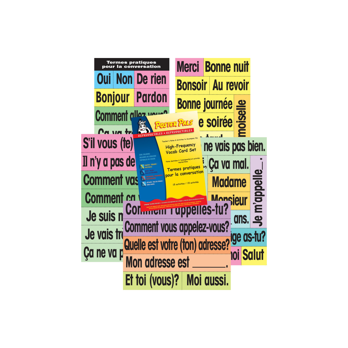 Get students talking with the "High Frequency French Vocabulary Card Set" of 40+ laminated cut-ups. Features commonly used greetings, replies, and terms of politeness. Color-coded. Use the cards to build conversations or in cooperative activities. Also includes a 50+ page reproducible booklet of activities and teacher notes. Colorful resource that motivates while teaching. Great for classroom and student reference. Made from durable stock. Perfect for the second language learner.