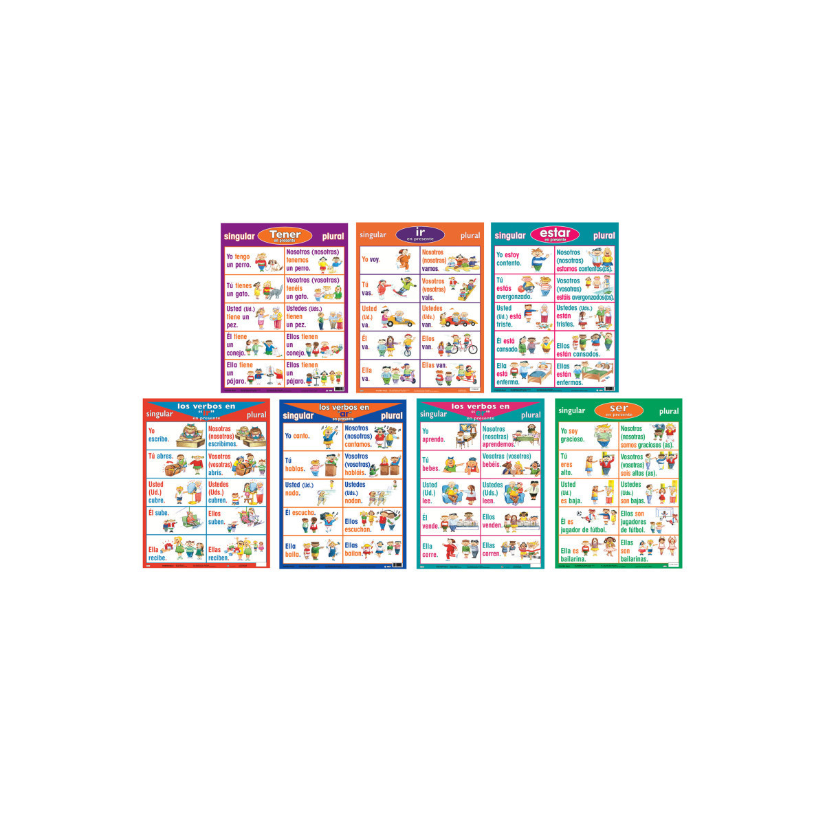 This 7-piece Spanish Verb Poster set is a colorful resource that motivates while teaching. Great for classroom and student reference. Made from durable stock. Perfect for the second language learner. Includes 7 large posters, 24" x 18" each.