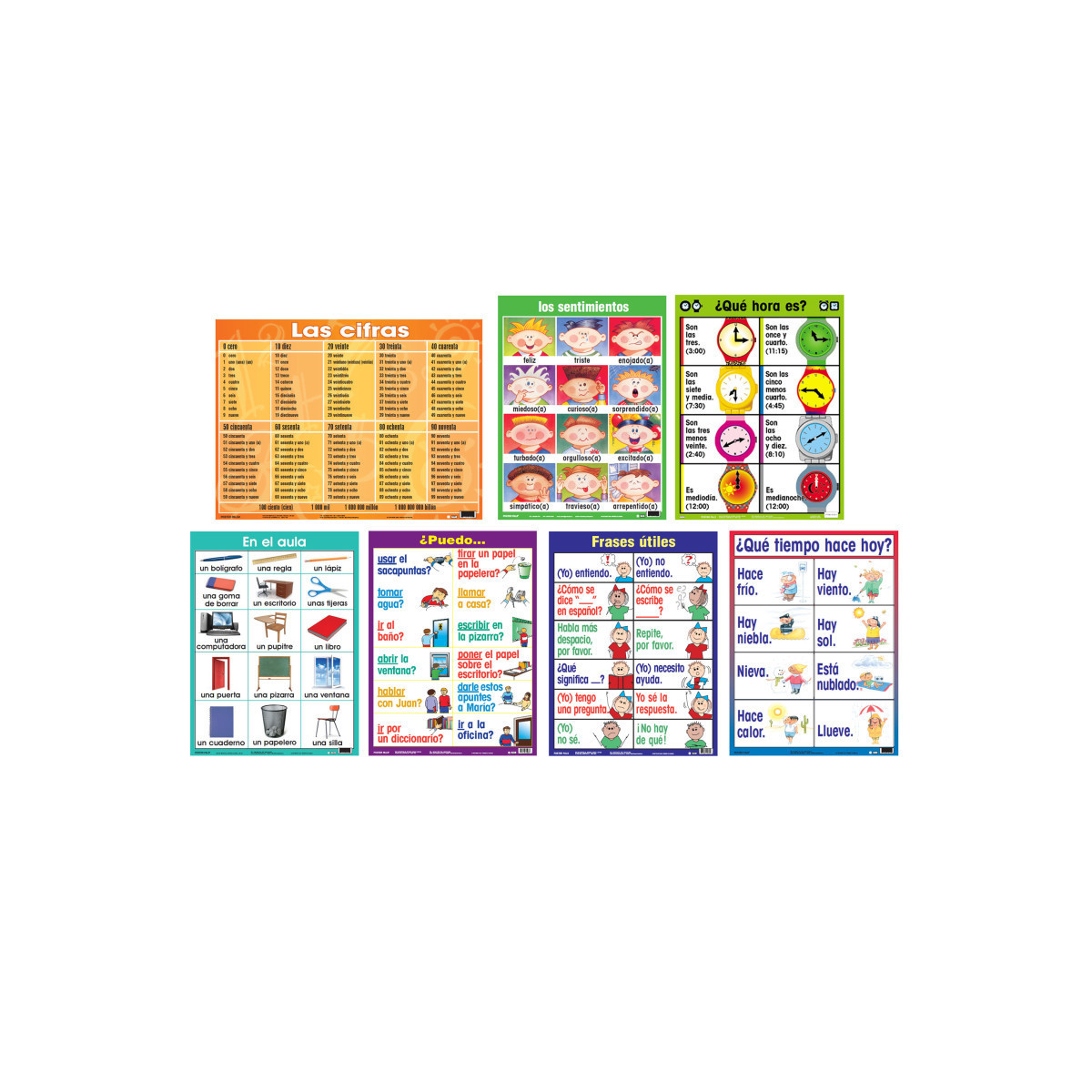 This 7-piece Essential Spanish Classroom Poster Set is a colorful resource that motivates while teaching. Great for classroom and student reference. Made from durable stock. Perfect for the second language learner. Includes 7 large posters, 24" x 18" each.