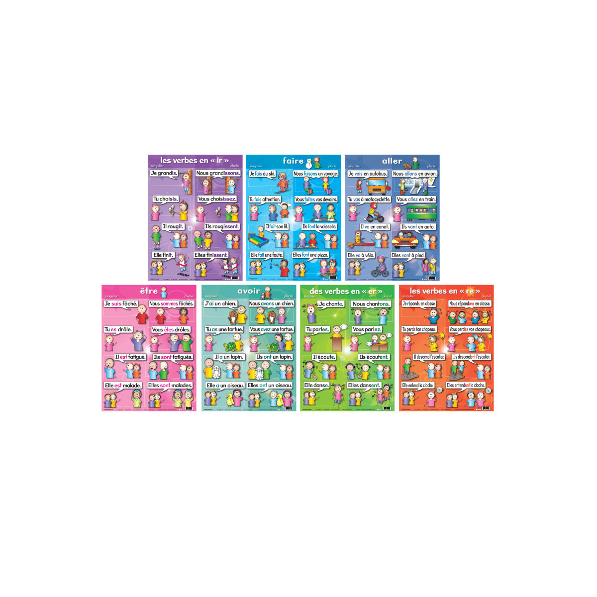 This 7-piece French Verb Poster set is a colorful resource that motivates while teaching. Great for classroom and student reference. Made from durable stock. Perfect for the second language learner. Includes 7 large posters, 24" x 18" each.