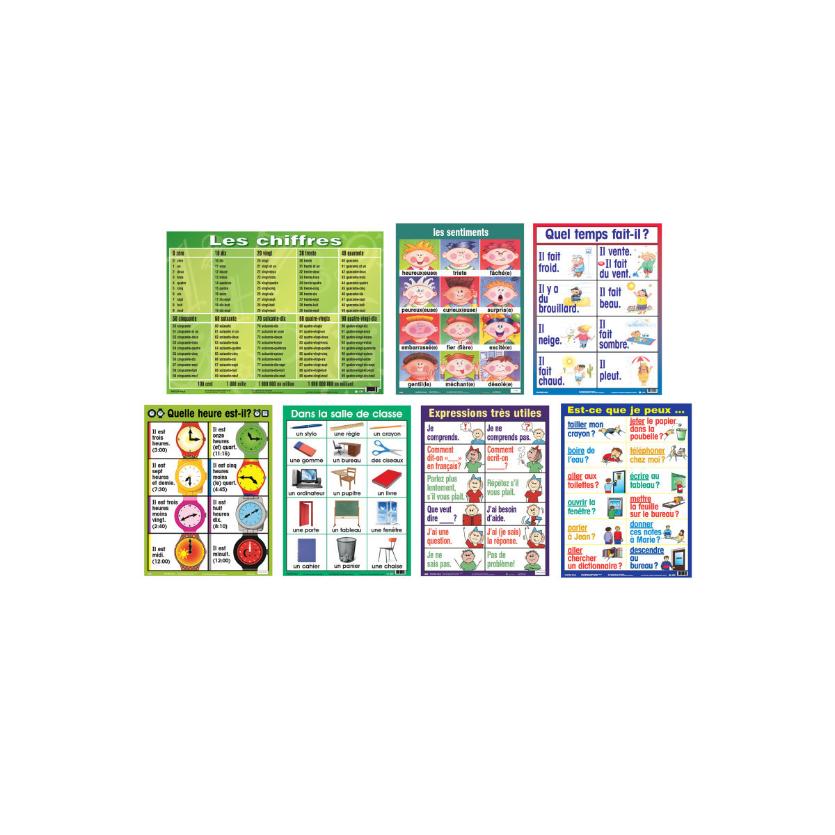 This 7-piece Essential French Classroom Poster Set is a colorful resource that motivates while teaching. Great for classroom and student reference. Made from durable stock. Perfect for the second language learner. Includes 7 large posters, 24" x 18" each.