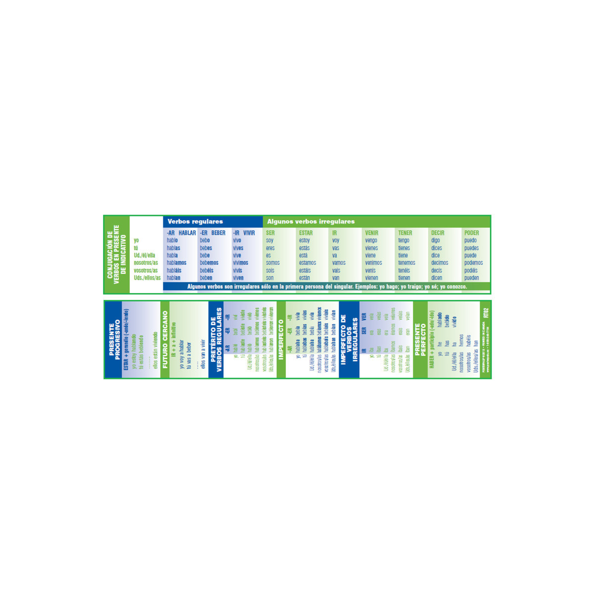 A Spanish verb guide at your student's fingertips. A handy reference for the following: present tense of regular verbs ER, IR, AR, irregular verbs SER, ESTAR, IR, VENIR, TENER, DECIR, PODER. Printed on both sides. Laminated. Includes 32 per pack, each 6 3/8" x 1 1/4".