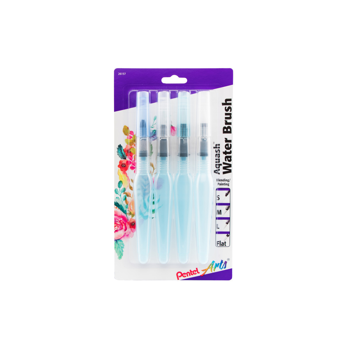 Create a watercolor masterpiece with the Aquash Water Brush. Fill barrel with water, and blend powdered pigment, watercolor crayons and pencils, pastels and more. These brushes are ideal to use with the Pentel Arts Sign Pen Brush products. Easy to control the water flow with just a squeeze of the barrel, and the durable nylon tip gives a sensitive response for delicate lines and pools of water. Easy to clean and dishwasher friendly, and contain four assorted brush sizes; small, medium, large and flat.