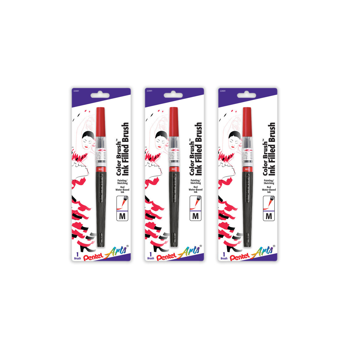The versatility of the Color Brush makes it easy to use between line and wash. The water-based dye ink dries quickly and produces rich intense colors. The durable nylon brush tip can flood wide strokes with solid color and then give a light touch to delicate lines. The refill barrels are easy to replace, and the reverse thread stops any leakage. Sold as a pack of 3.