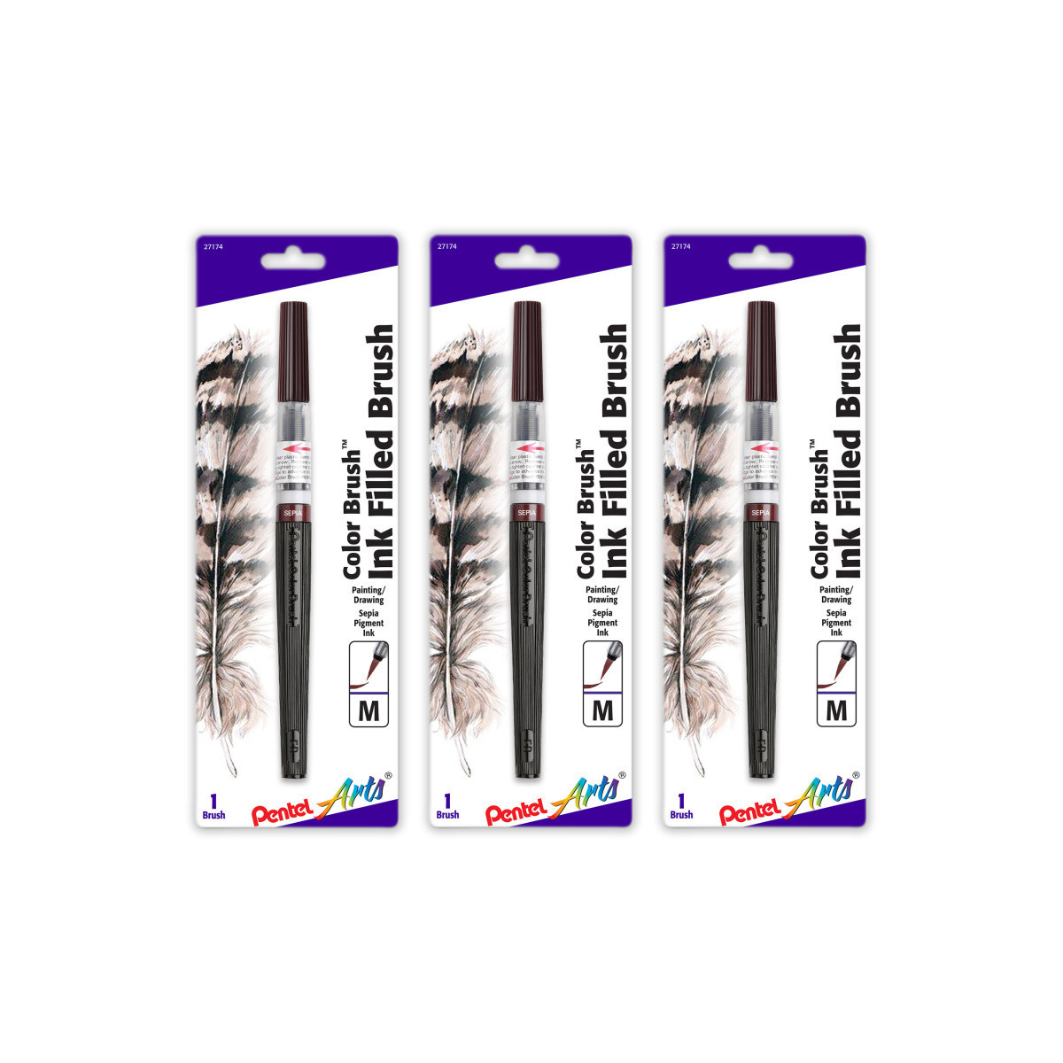 The versatility of the Color Brush makes it easy to use between line and wash. The water-based dye ink dries quickly and produces rich intense colors. The durable nylon brush tip can flood wide strokes with solid color and then give a light touch to delicate lines. The refill barrels are easy to replace, and the reverse thread stops any leakage. Sold as a pack of 3.