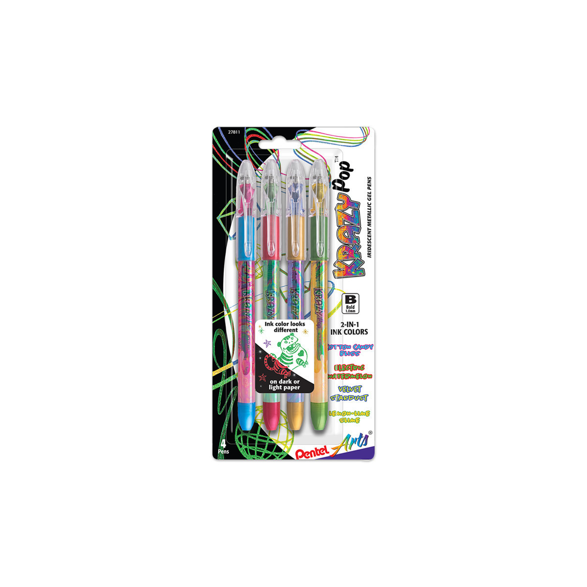 The Pentel Krazy Pop gel pens add a "Pop" outrageous color to your writing world. New glittery iridescent ink adds a dazzling, dual-color sparkle effect on light or dark colored paper to make your writing and artwork stand out. Smooth gel ink and extra-long balanced barrel for effortless writing and control. Latex-free grip for comfortable writing and drawing. 1.0mm tip writes bold lines. Each pack includes 4 pens in assorted colors.