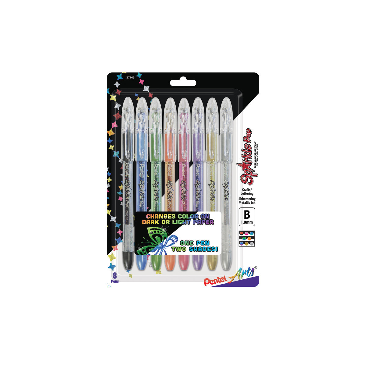 The Pentel Sparkle Pop gel pens add a unique “POP beauty” of color to your writing world. The sparkling iridescent ink changes color when writing on black or white paper to make your writing and artwork stand out. Smooth metallic gel ink and an extra-long balanced barrel for effortless writing and control. Latex-free grip for comfortable writing and drawing. 1.0mm metal tip writes bold lines. Package includes 8 assorted inks.