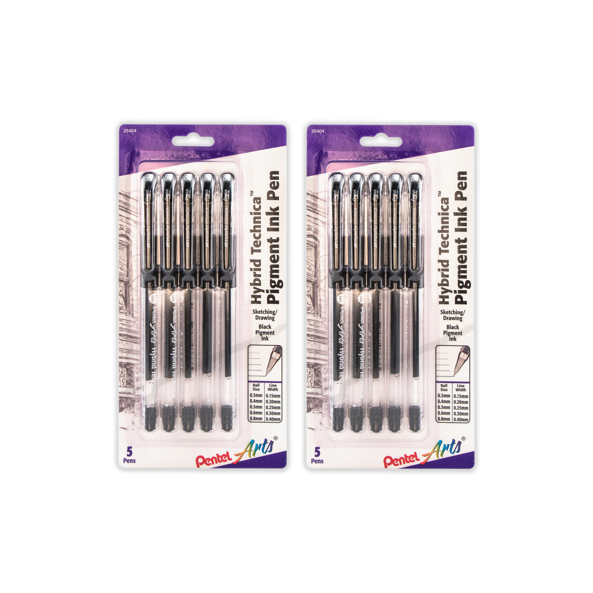 The Pentel Arts Hybrid Technica gel pen contains acid-free, water-resistant, archival ink that will protect your sketches, drawings and anime from fading over time. Archival roller system with smooth, pigmented ink delivered through the long-lasting ball delivery system. The tungsten carbide roller tip guarantees a consistent line. Pigmented ink is light-fast, bleed-proof, water-resistant and fade-resistant. Acid-free, archival safe ink is ideal for sketching, drawing, manga art and so much more. Each pack includes 5 pens in 5 line sizes: 0.3mm (extra-fine), 0.4mm (fine), 0.5mm (medium), 0.6mm (bold), and 0.8mm. Sold as 2 packs for a total of 10 pens.