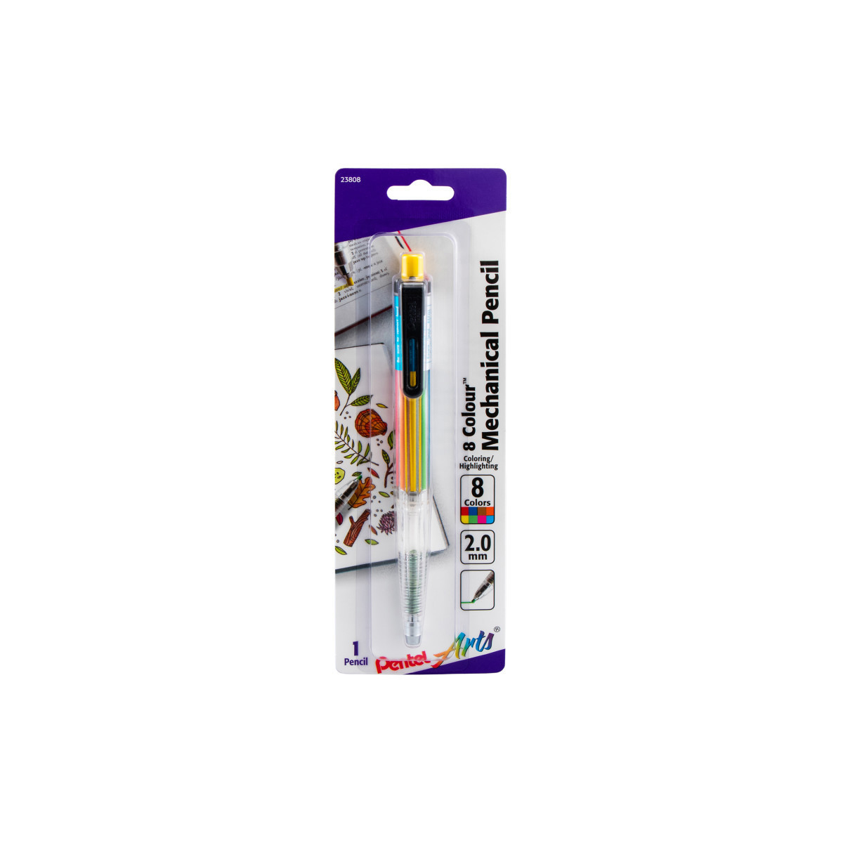 Produce vibrant colorful drawings with this Pentel 8-Color mechanical pencil. The color selection offers variety and flexibility, while the integrated clip easily attaches to a notebook or planner. A 2.0mm tip size lets you produce bold dramatic strokes or fill in lines. This refillable Pentel 8-Color mechanical pencil has a Pentel CH2 lead for reliable performance and is ideal for highlighting on linen fiber and high-cotton paper. Colors include Red, Blue, Brown, Orange, Yellow, Light Green, Pink, and Light Blue.