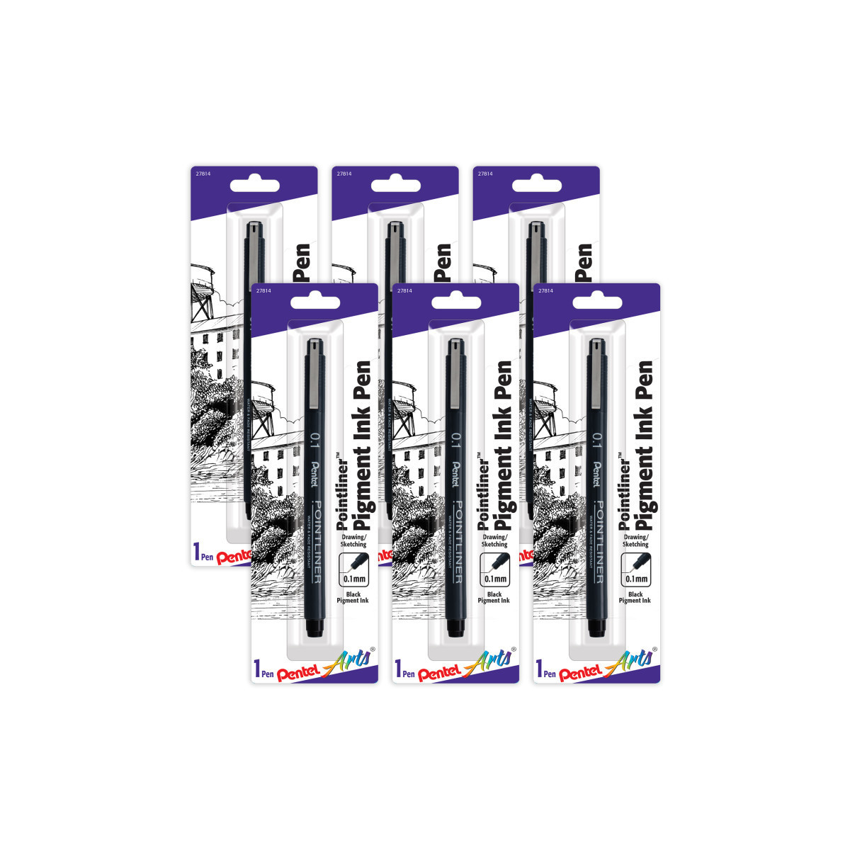 The Pointliner lines draw clean, in a rich solid black pigment ink. The durable plastic nib does not degrade or split over time like competitive brands. The ink flow is consistent is perfect for shading techniques, such as cross hatching and stippling. The waterproof ink dries quickly and integrates well with watercolor washes. Sold as a pack of 6.