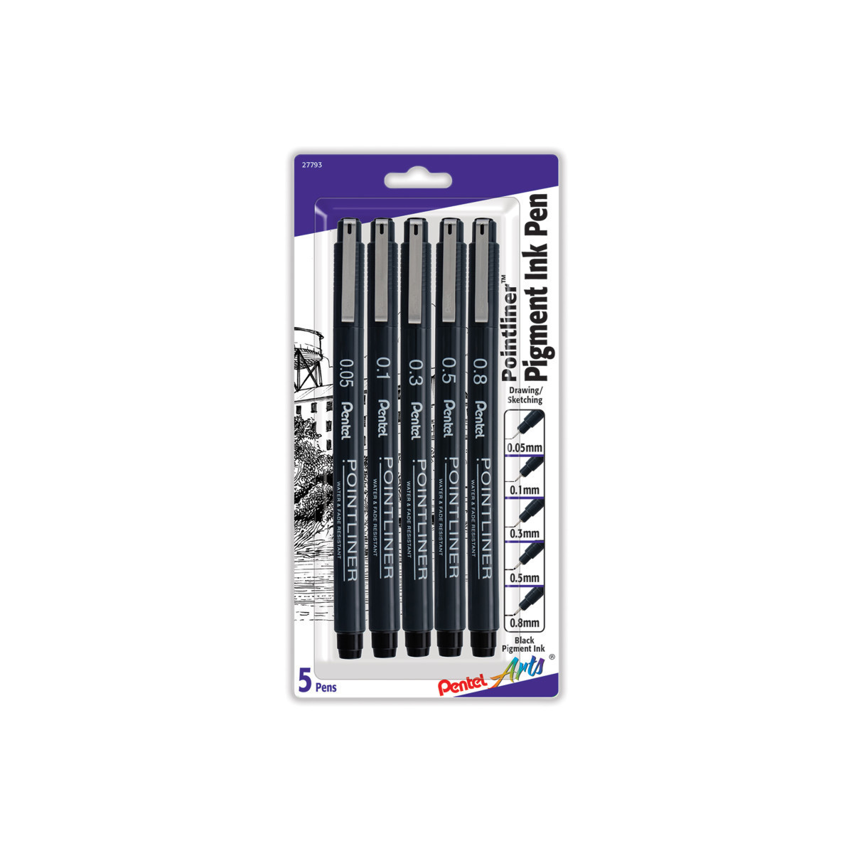 The Pointliner lines draw clean, in a rich solid black pigment ink. The durable plastic nib does not degrade or split over time like competitive brands. The ink flow is consistent is perfect for shading techniques, such as cross hatching and stippling. The waterproof ink dries quickly and integrates well with watercolor washes. Each pack includes 5 pens in 5 line sizes: 0.05mm, 0.1mm, 0.3mm, 0.5mm, and 0.8mm.
