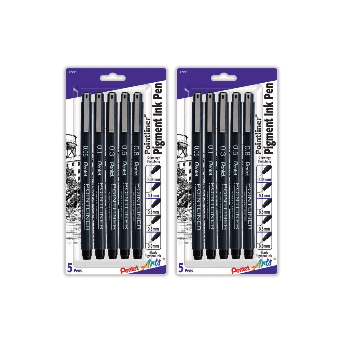 The Pointliner lines draw clean, in a rich solid black pigment ink. The durable plastic nib does not degrade or split over time like competitive brands. The ink flow is consistent is perfect for shading techniques, such as cross hatching and stippling. The waterproof ink dries quickly and integrates well with watercolor washes. Each set includes 5 pens in 5 line sizes: 0.05mm, 0.1mm, 0.3mm, 0.5mm, and 0.8mm. Sold as 2 sets for a total of 10 pens.