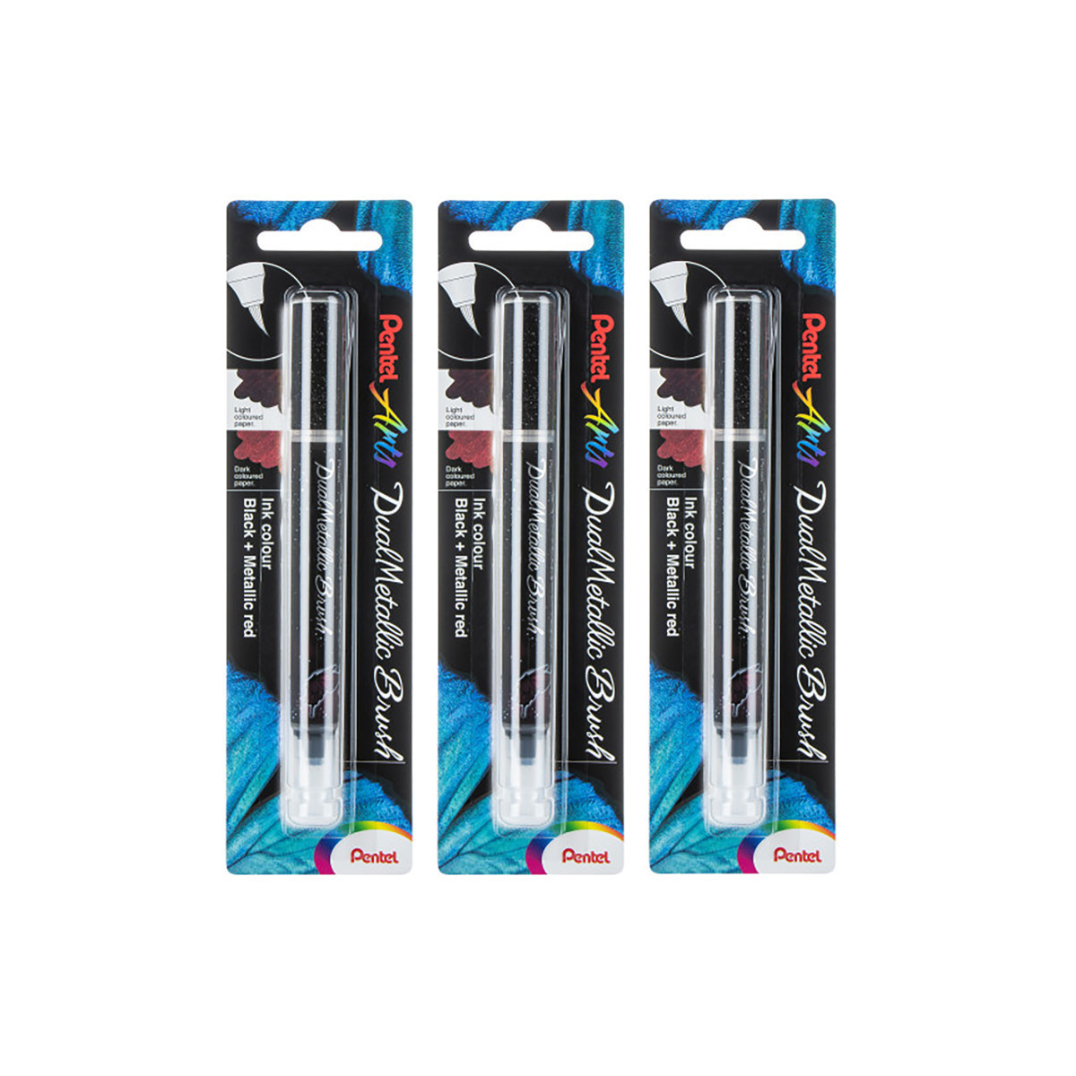 Pentel Arts DualMetallic Brush, Black/Metallic Red Ink, Pack of 3