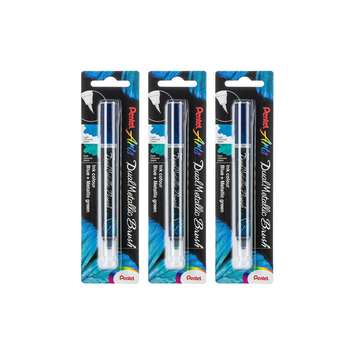 Pentel Arts DualMetallic Brush, Blue/Metallic Green Ink, Pack of 3