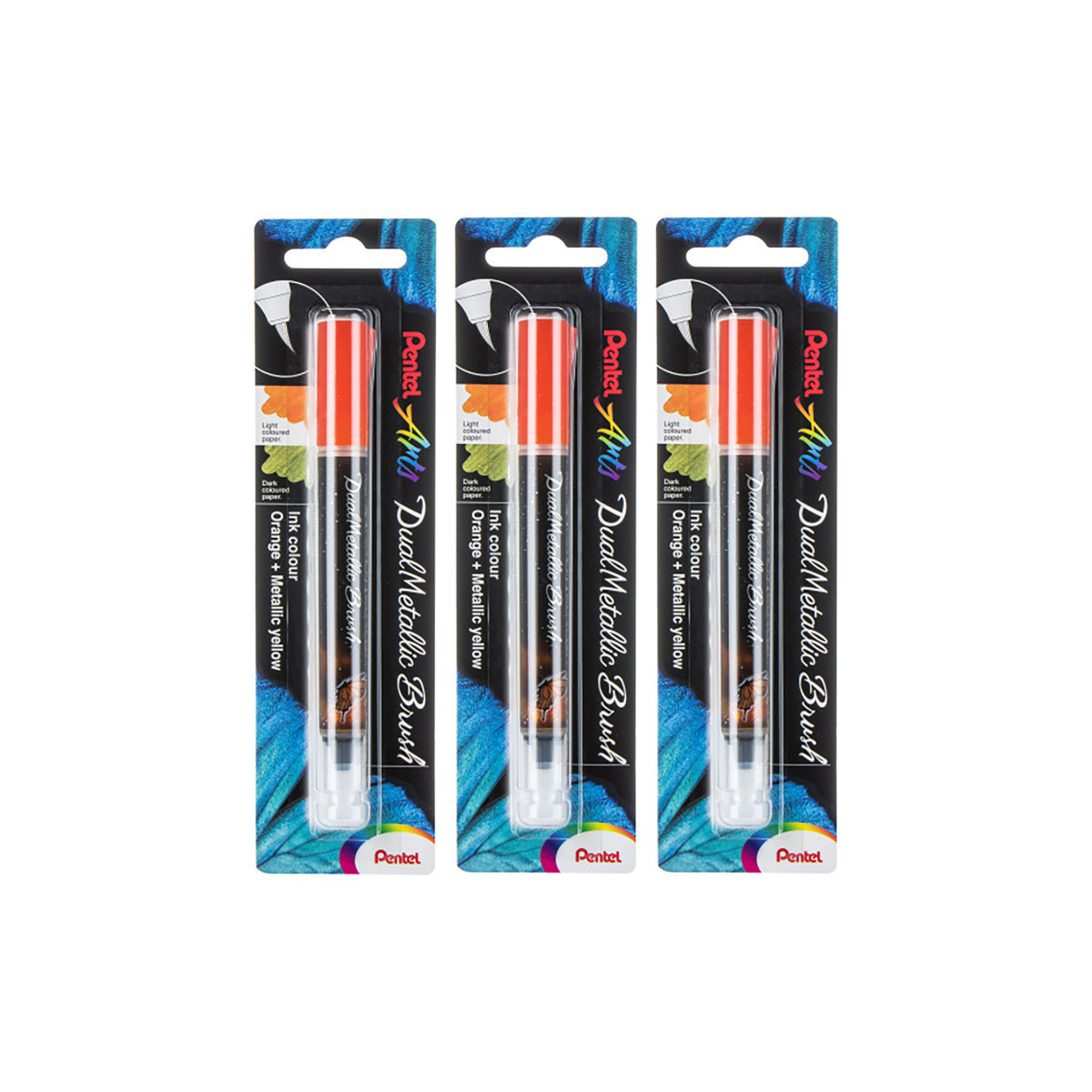 Pentel Arts DualMetallic Brush, Orange/Metallic Yellow Ink, Pack of 3
