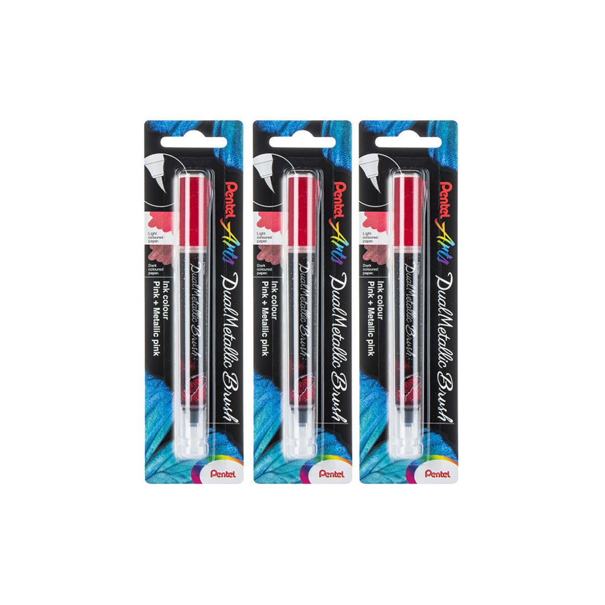 The DualMetallic Brush Pen features innovative reflective and sparkling iridescent ink that is ultra-glittery. The ink looks like different colors when drawing on black or white paper, and is ideal for cards, invitations, drawing, doodles, and other designs. The durable nylon brush holds its shape, and the push plunger provides the ink flow. Sold as a pack of 3.