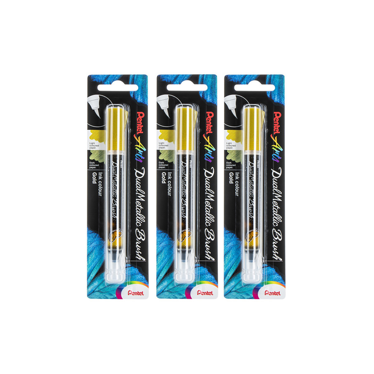 The DualMetallic Brush Pen features innovative reflective and sparkling iridescent ink that is ultra-glittery. The ink looks like different colors when drawing on black or white paper, and is ideal for cards, invitations, drawing, doodles, and other designs. The durable nylon brush holds its shape, and the push plunger provides the ink flow. Sold as a pack of 3.