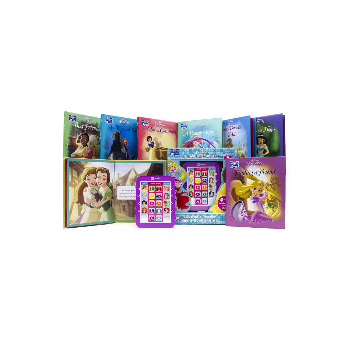 Dream big with your favorite Princess friends! This eight-book library, packed with its own sleek module, helps your child bridge the gap between "being read to" and "reading" on her own. Choose a book, press the matching book and page buttons, and hear the story read aloud, with expressive narration and engaging sound effects. Follow along in the storybook as a first step toward independent reading!