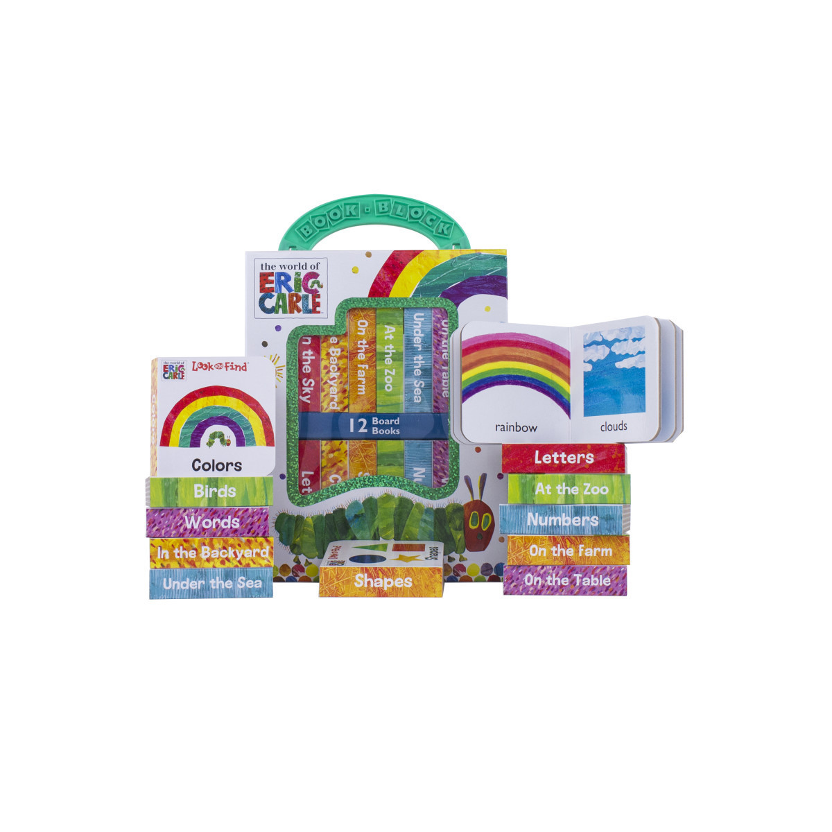 Look, find, and learn with the Very Hungry Caterpillar! This take-along library includes 12 sturdy little board books featuring classic Eric Carle art. Six "Look and Find" titles let little ones search the pages for hidden objects. Six "Here, There, and Everywhere" titles explore concepts like numbers, letters, colors, and shapes. It's a perfect first reading experience for little ones who are "hungry" for fun!