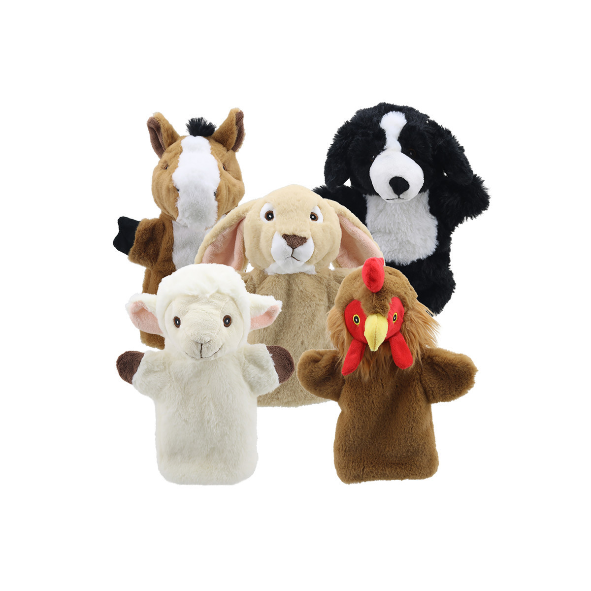 This Animal Puppet Buddies Farm Set brings together animals found in the barnyard. From the soft woolly coat Lamb, horse, the friendly Border Collie, loppy eared Rabbit to the bright yellow beak Hen. Ideal for bringing playtime to life. This set is great a great addition to story time. Encourages language development and communications. Hand puppets stimulate creativity, imagination and help develop fine motor skills.