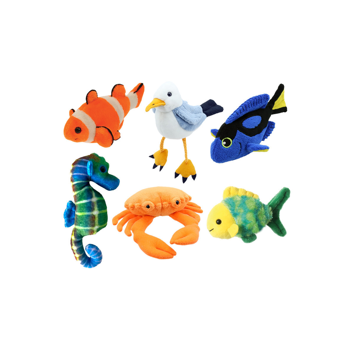 This Coral Reef Finger Puppet Set brings the oceans wonders to your fingertips. From the Blue Tang & Clown Fish to the colorful Seahorse, the adorable Crab and the charming Seagull. Our finger puppets encourage communication and language development and help fine motor skills.