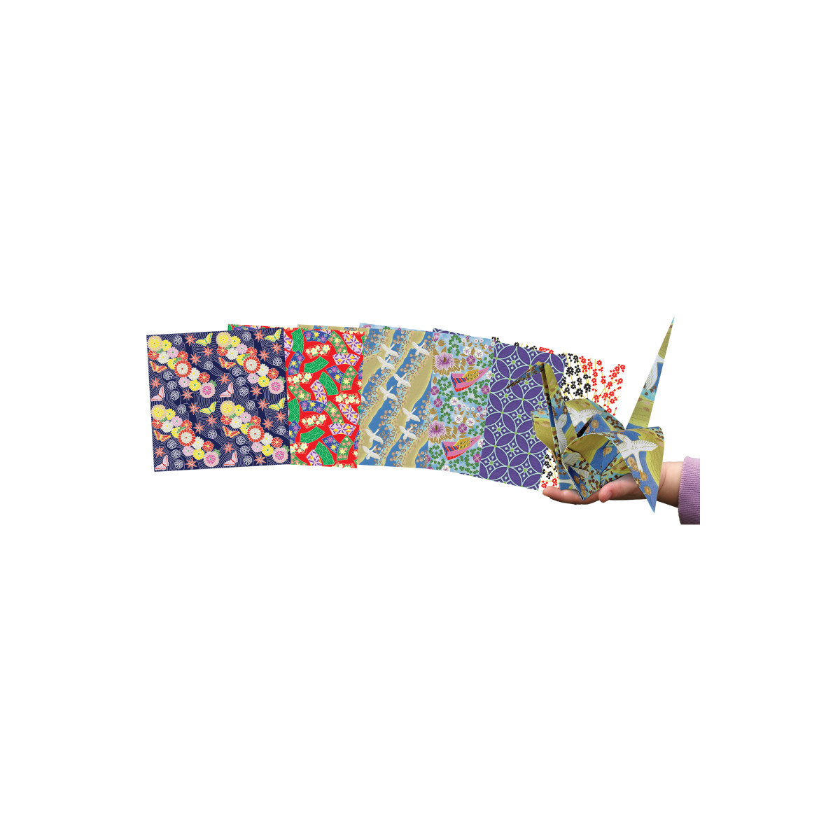 Set of double-sided origami paper for learning ancient craft of paper folding.