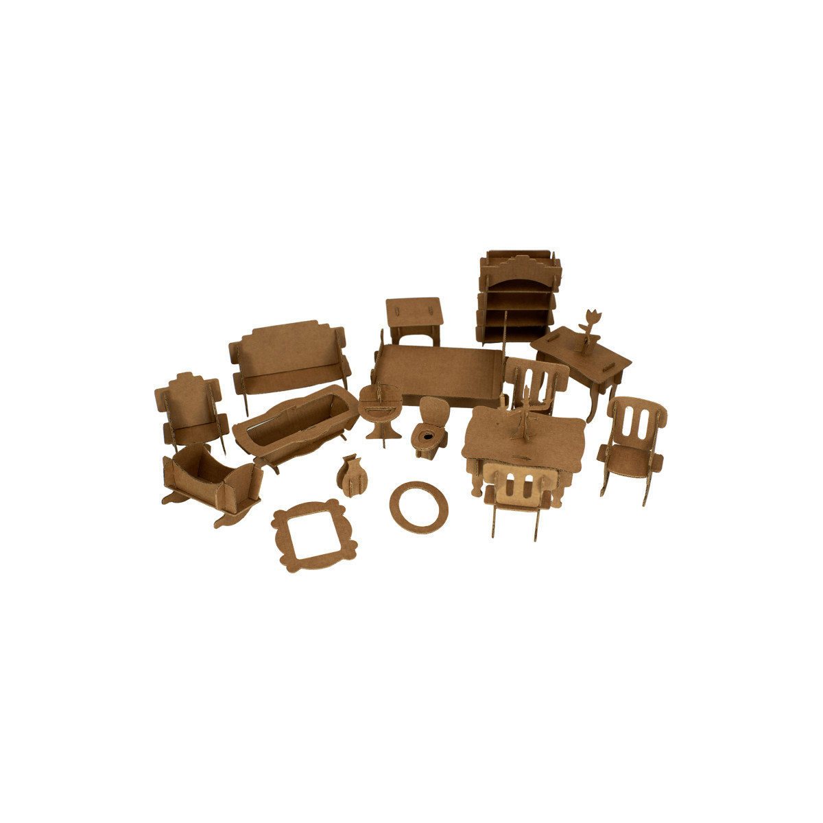 Elevate your dollhouse or diorama with adorable furniture pieces! Designed for six unique rooms, the simple slot-design makes assembly a breeze. Add your personal touch with crayons, paints, and markers, detailing each piece to match your desired aesthetic. From cozy bedrooms to elegant dining rooms, each back includes 18 crafted furniture pieces to bring your miniature world to life. Whether setting the scene for a welcoming family dinner or a relaxing lounge session, the Dollhouse Furniture Pack offers endless opportunities for imaginative play and creative expression! For added fun, pair it with Roylco's Classroom Doll House Pack, sold separately, for the ultimate playtime experience. Includes: 18 pieces of furniture, up to 3" x 3" x 4-3/4″ (7.7 x 7.5 x 12 cm) when assembled.