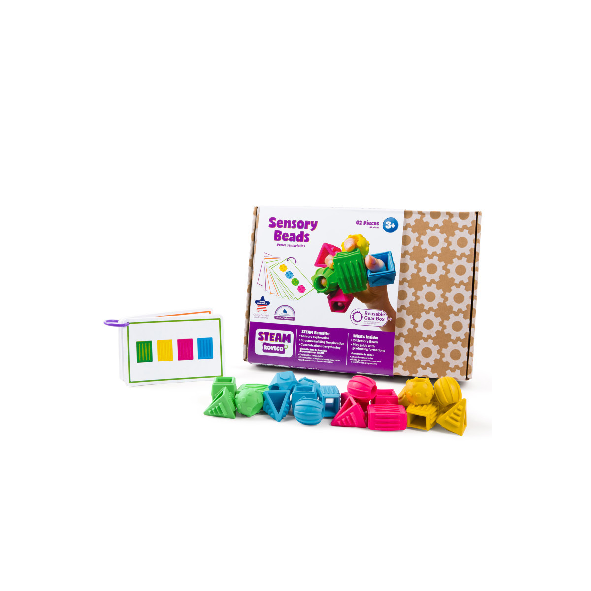 Sensory beads feature 24 pieces in 6 extra-large geometric shapes in 4 bright colors, all with texture patterns! Touch and squeeze the rubbery bumps, ridges, and grooves on each bead before using the play guide to direct activities. These have been designed to kick start young engineering skills and fine motor skills alike by sequencing beads according to the play guide and then creating wobbly towers.
