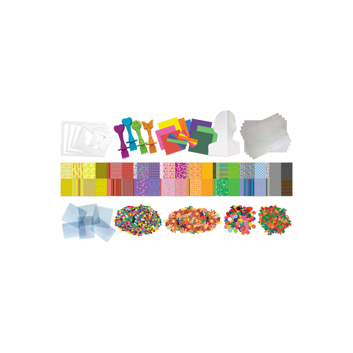 The Big Box of Art Materials™ contains so many unique art products that an entire class can create many wonderful and interesting projects. Throughout this guide, you will find ways to use one or several products together to create fun project activities! Once you've tried the ideas that we've suggested, create some of your own! With these supplies and your imagination, the possibilities are endless! Contents include: Colored Craft Sticks, Parquetry Collage Shapes, Art-a-Roni®, Mini Picture Frames, Collage Disks, Magnetic Strips, Painting Sponges, Peel & Stick Stickers, Felt Shapes, Wood Shapes, Bright Buttons, Shredded Tissue, Mosaic Squares, Multi-Color Felt Sheets, Plastic Beads, Color, Cut & Fold Paper, Plastic Thread, Stained Glass Paper, Leather, Amazing Animal Paper, Craft Yarn, Fabulous Fabric Paper, Burlap, Metallic Paper, Foam Shapes, and Bug Paper.