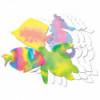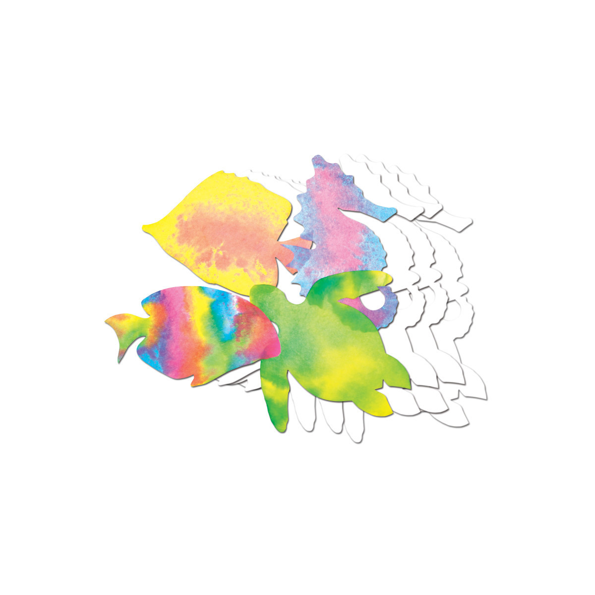 Spray liquid watercolor paint or food color over fabric-like paper with interesting texture. Watch the colors flow and blend. Once the paint is dry, embellish with markers, crayons and glitter glue. Beautiful results are guaranteed! Great for all ages and skill levels. Sealife shapes measure 7" x 10" (18 x 28 cm). Each pack includes 48 sheets and an idea guide.