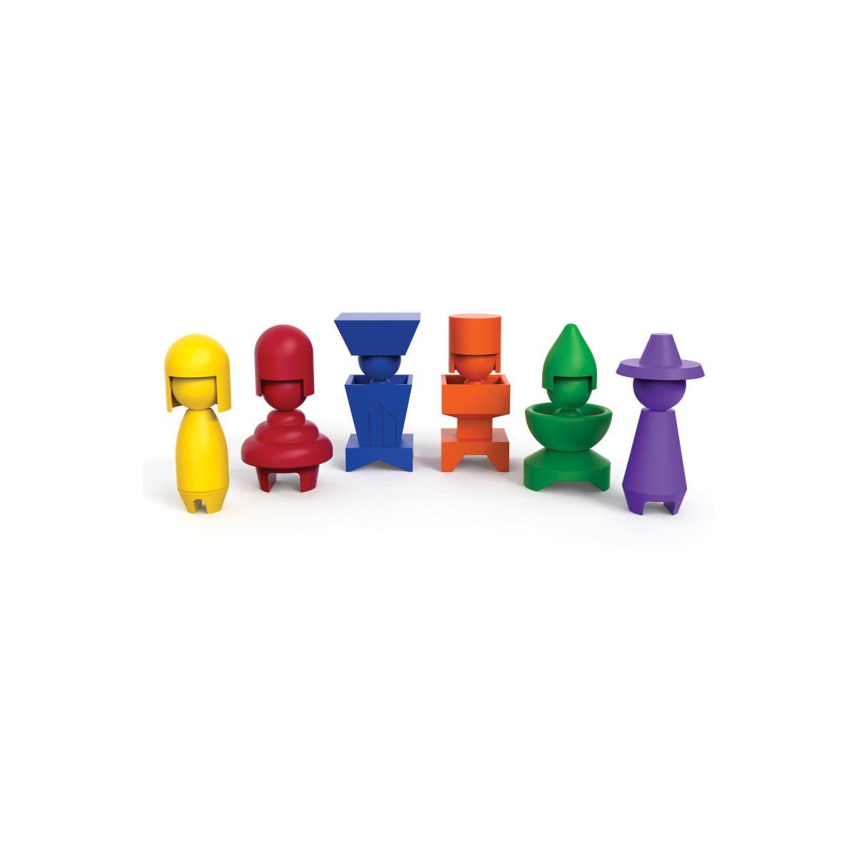 Explore stacking, logic, and emotion building skills! Each set features six captivating geometric dolls, crafted from four stackable pieces molded from recycled plastic. Encourage young minds to explore creative possibilities by matching their dolls to the included cards or inventing their own imaginative combinations. These dolls aren't just for play -- they're conversation starters, sparking discussions about moods and emotions, fostering empathy and understanding. Includes 6 dolls up to 2" x 3-1/2″ (5 x 9 cm) when assembled.