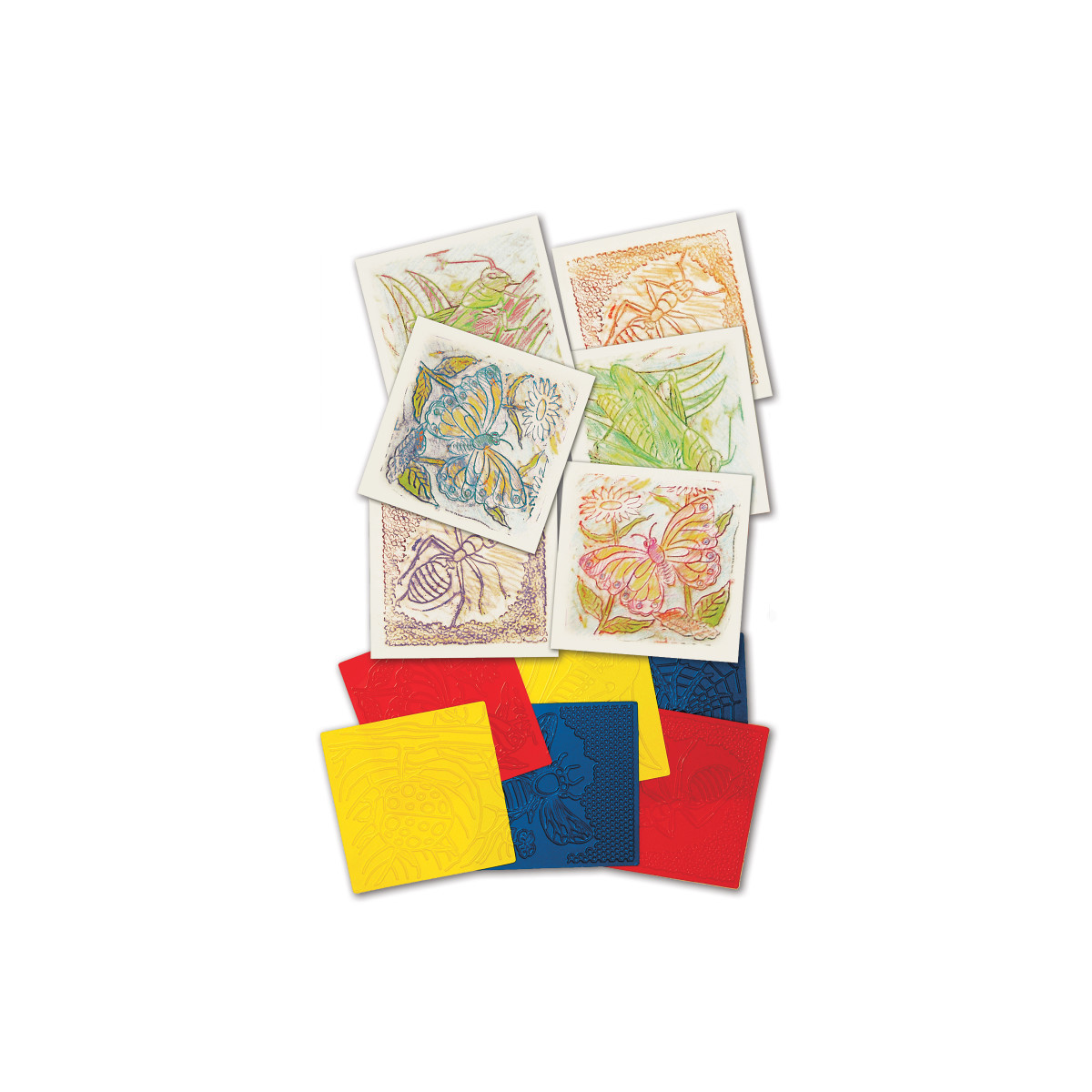 Place a sheet of paper over the rubbing plate and rub with the side of a crayon to reveal the pattern underneath. Color in the details with markers or colored pencils. Fill with or press into modeling clay. Great with papier mâché! Make sun catchers using white glue and food color. Simply fill a rubbing plate and let dry. Peel the resulting mold off and you are done. Plates measure 7" x 7" (18 cm). Each pack includes 6 rubbing plates and an idea guide.