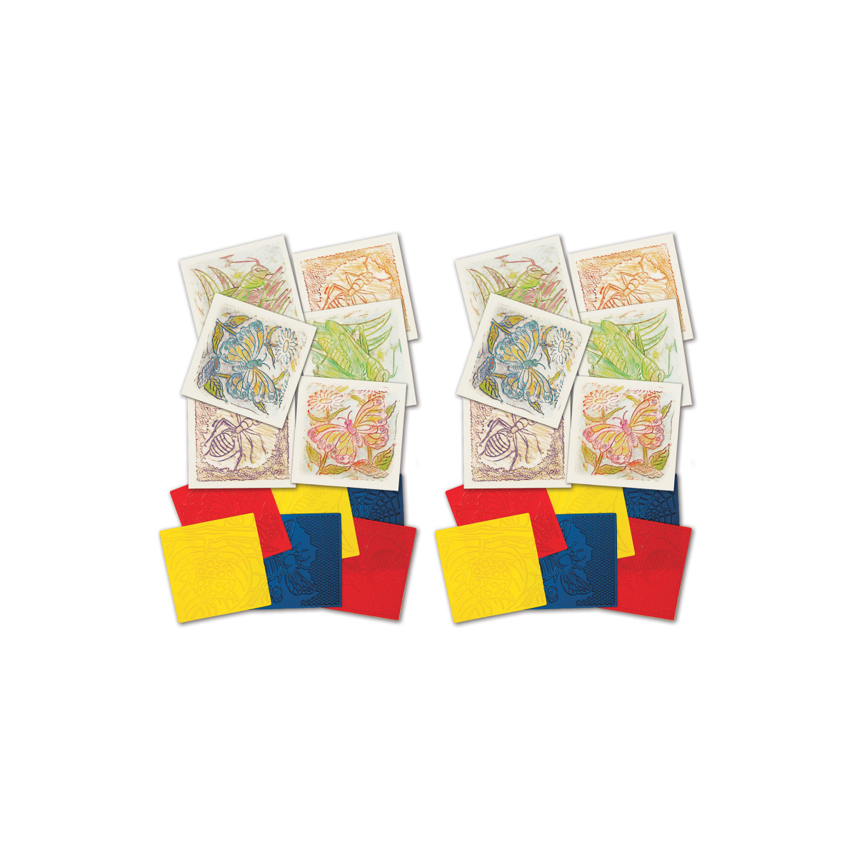 Place a sheet of paper over the rubbing plate and rub with the side of a crayon to reveal the pattern underneath. Color in the details with markers or colored pencils. Fill with or press into modeling clay. Great with papier mâché! Make sun catchers using white glue and food color. Simply fill a rubbing plate and let dry. Peel the resulting mold off and you are done. Plates measure 7" x 7" (18 cm). Each pack includes 6 rubbing plates and an idea guide. Sold as 2 packs for a total of 12 plates.