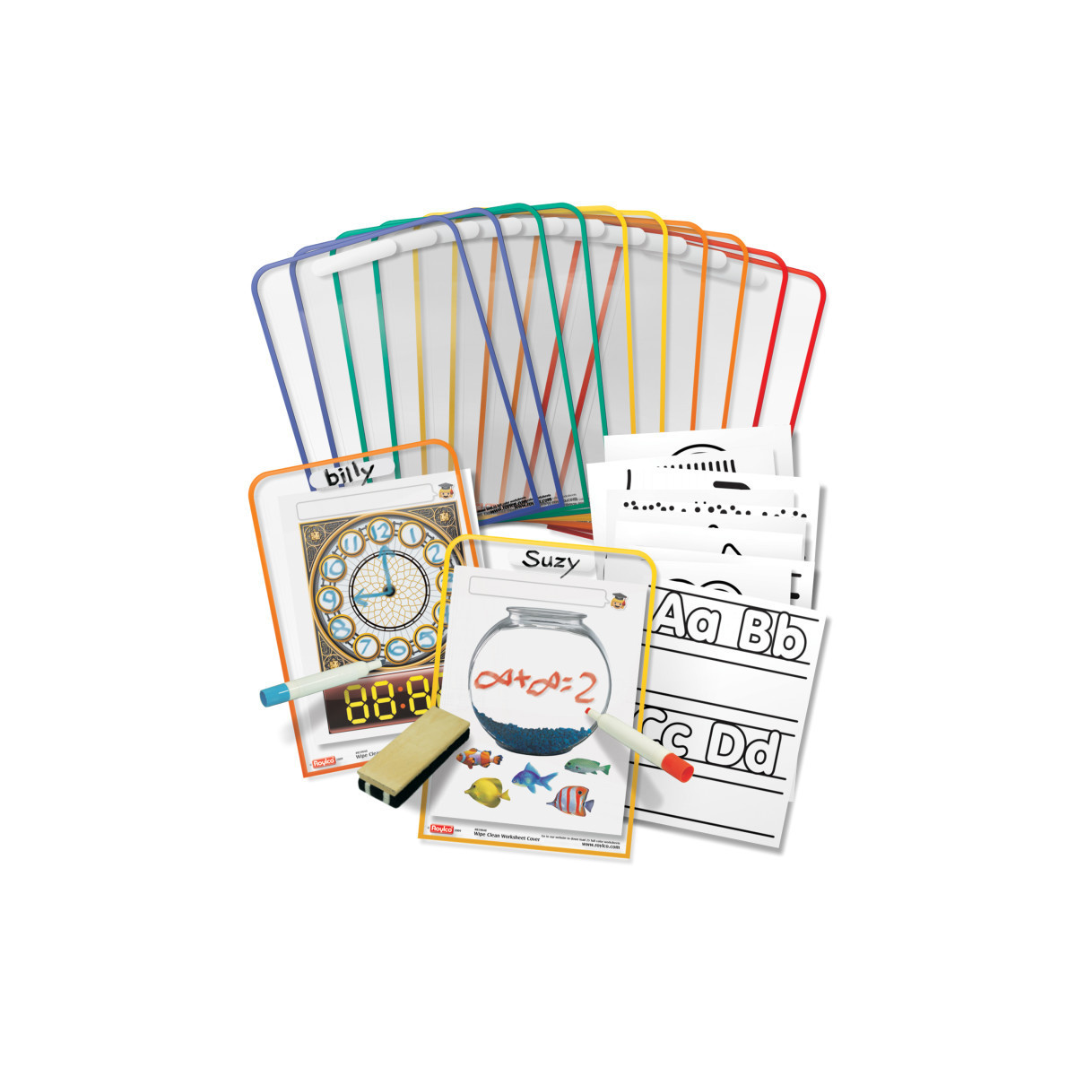 Save paper, improve the effectiveness for worksheets, engage students, reduce prep time, and increase teaching opportunities with our set of adaptable dry erase covers. Slide in your favorite worksheets or go to our website and download 25 full color worksheets covering language, writing, science, geography and math concepts. Covers measures 8.8" x 12.7" (22 x 32 cm). Each pack includes 10 re-usable dry erase worksheets covers in 5 colors. Includes idea guide.