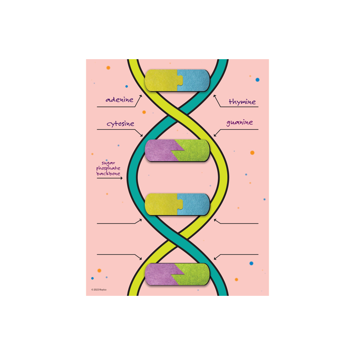 - Soft felt pieces represent base pairs of DNA.