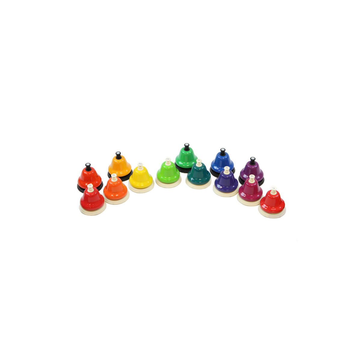 Fully chromatic CHROMA-NOTES® 13-note desk bells in Boomwhacker colors. Manufactured to the highest standards, the top quality construction and accurate intonation make these bells the best value available. The CHROMA-NOTES® colors make it more fun to learn and play along with Boomwhackers music tubes and Boomwhacker educational materials. Each metal bell is marked with the proper note and number to help children learn the musical scale. Desk bells are struck on the top, making them ideal for young children, special needs communities or anyone with limited mobility. Set contains the 13 notes in a chromatic scale C-c.