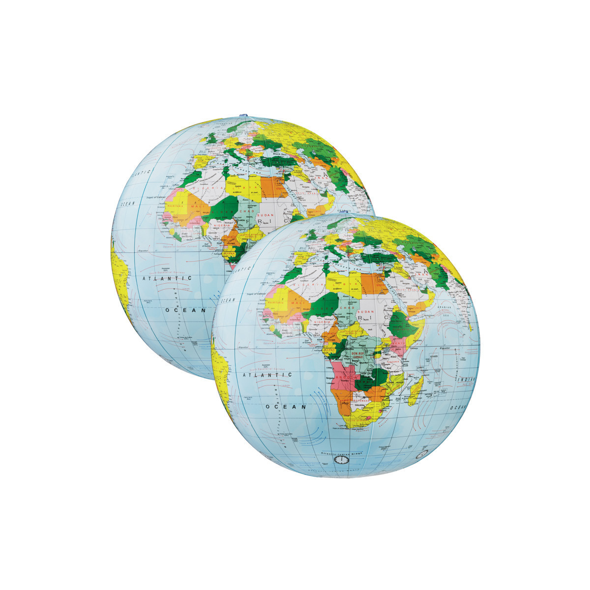 Introduce children to geography with this inflatable globe. Globe is brilliantly colored and extremely durable. Each globe has a 16" diameter. Sold as a pack of 2 globes.