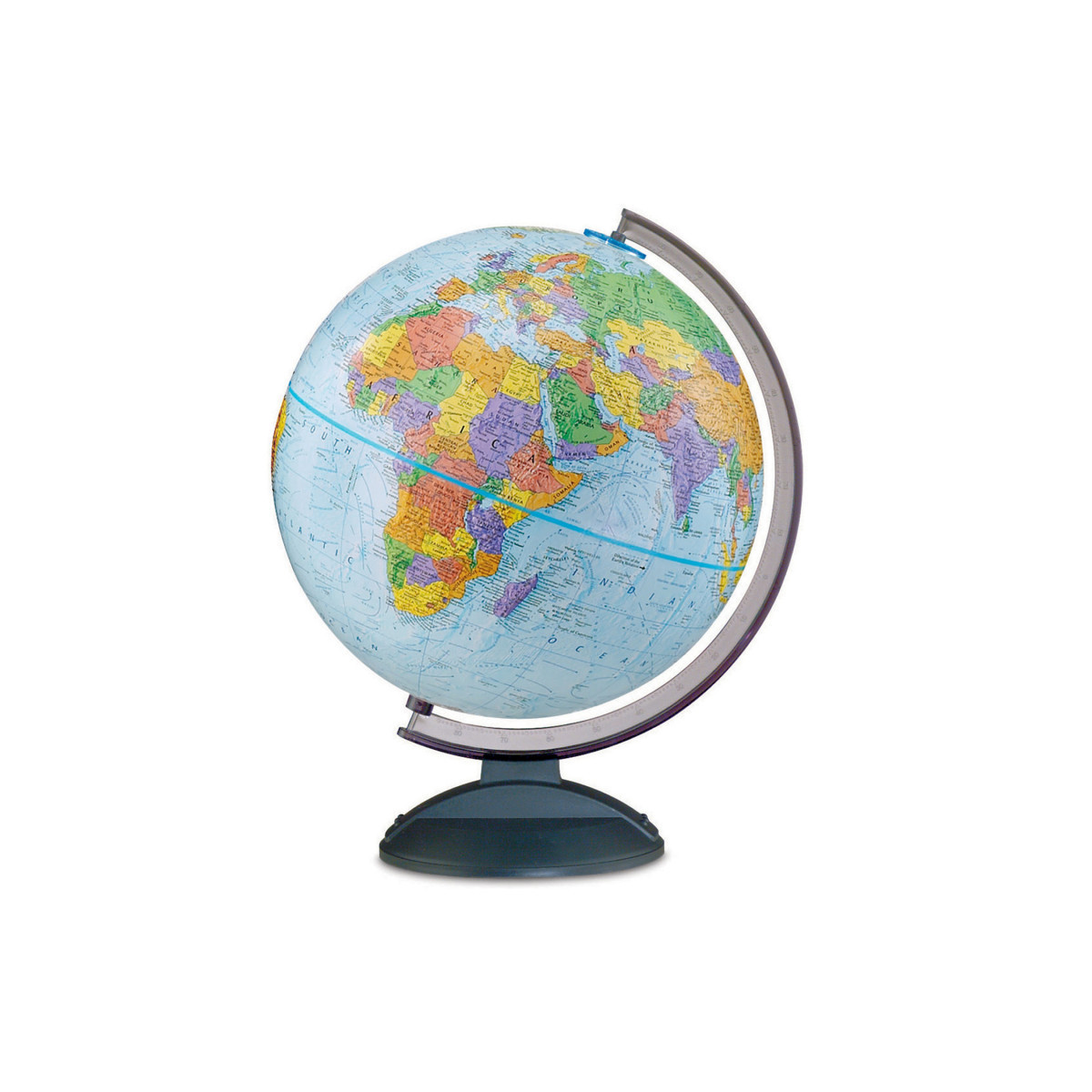 This wonderful world globe features over 4000 place names and political boundaries. This globe is held by a durable, scratch resistant base and semi meridian. The semi meridian features the degrees of latitude. Standing 16" tall, this globe is affordable and one of our best selling models. It is perfect for the home, office or dorm room. The size lends itself to fit nicely on shelves, desktops or conference room tables. The vivid colors highlight the raised relief embossing and political/geographical aspects of this up to date globe map. A great value and a wonderful gift, this world globe is perfect for home schooling or for the student with a interest and love for geography. Recommended for ages 8 and up.