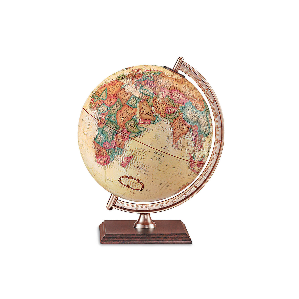 This 9" antique-ocean globe is completed by walnut-finished base and gold-colored molded meridian and riser. Place it on your desk and keep an eye on the world.