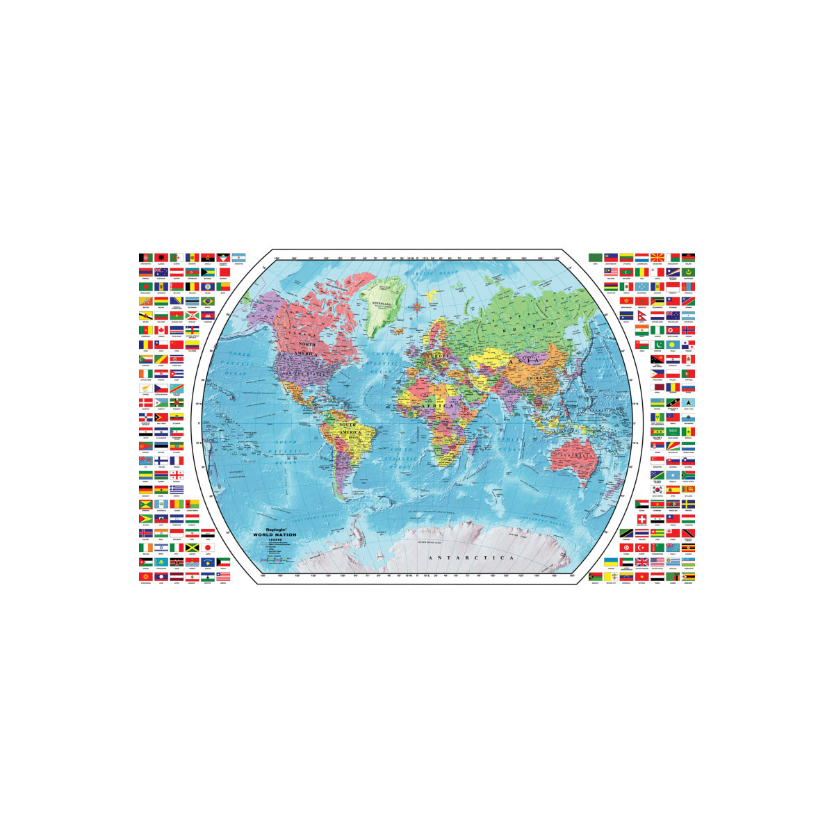 The Replogle World Map is easy to read and is an essential learning tool for the home and classroom. This map is beautifully framed by all the corresponding flags of the word. All colors on the map correspond and match the colors on Replogle educational globes to help reinforce geographic location learning. The map measures 49"W x 33"H.