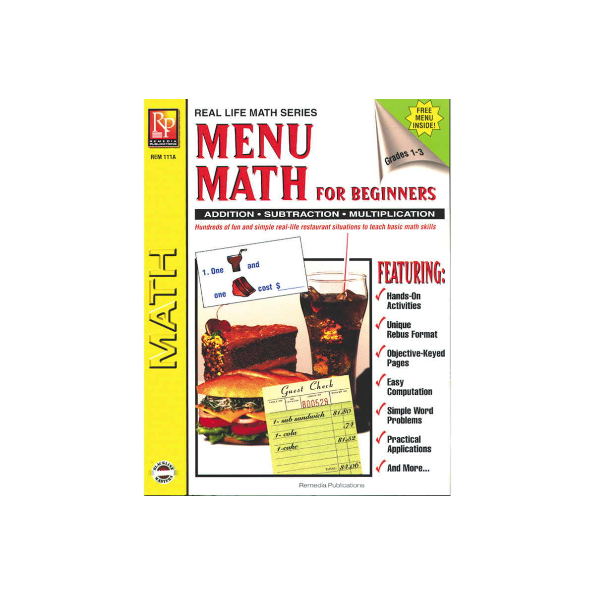 Reinforce your basic math program with our Real-Life Math book! This fun and effective book teaches simple addition, subtraction, and multiplication through the use of real-life situations. Students will have a great time as they refer to the colorful menu to figure costs when spending money at a restaurant. From pizza to pancakes, the easy-to-read price list generates hundreds of simple rebus and word problems sure to improve any student's math skills.
