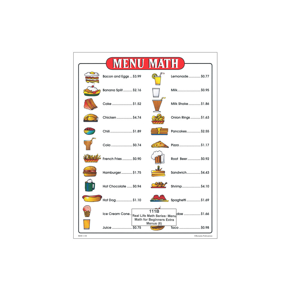 Set of 6 extra menus for Menu Math for Beginners. Perfect for role-playing situations and classrooms where students will benefit from having their own full-color, realistic price list to use instead of a black and white photocopy.