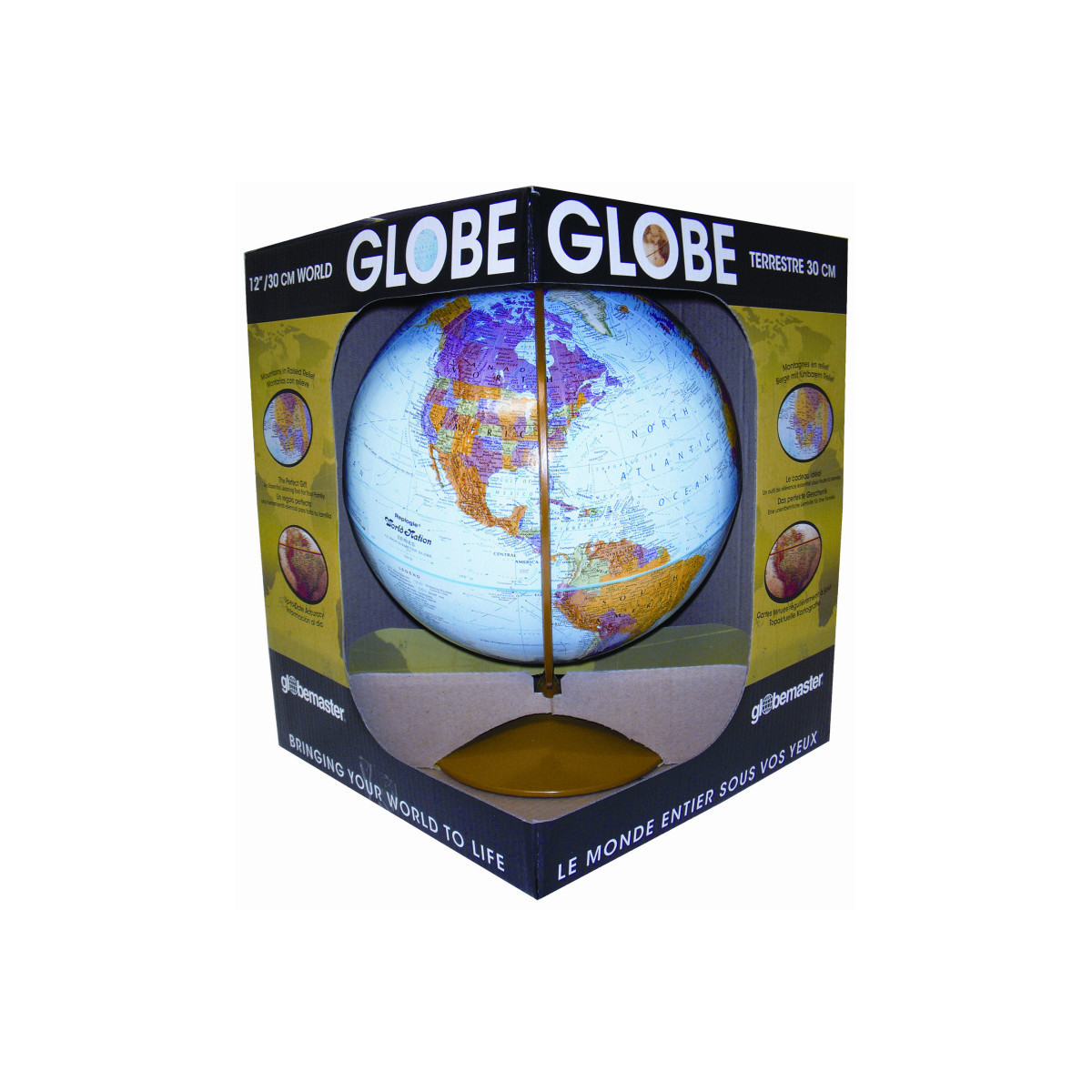 The Replogle Explorer 12" Desktop Raised Relief Blue Ocean World Globe is among our most popular models. Striking colors and vast amount of information will peak the interest of any geographical connoisseur. This blue ocean globes features over 4000 place names and political boundaries. The globe is held by a gold painted durable, sturdy base and numbered semi meridian that marks the earth's degrees of latitude. The raised relief embossing reveals the world's main mountain ranges in a three dimensional way. This world globe is a great value and the perfect size and for desktops and book shelves. A great STEM teaching tool for classrooms or at home learning. Packaged in a display box.