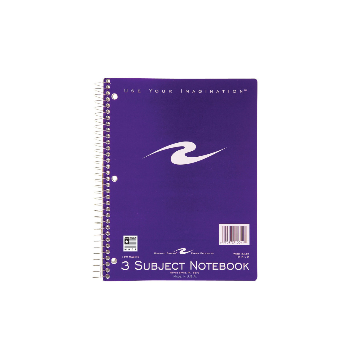 Three subject wirebound notebook. Smooth, white, 15lb writing paper is wide ruled with a red margin line. Covers are printed on bright board in 4 assorted colors (no color choice). Wire ends are coil-locked for snag-proof performance. Each book is 10.5" x 8" and contains 120 sheets of writing paper, along with 2 subject dividers. 24 books per case. Proudly made in USA!