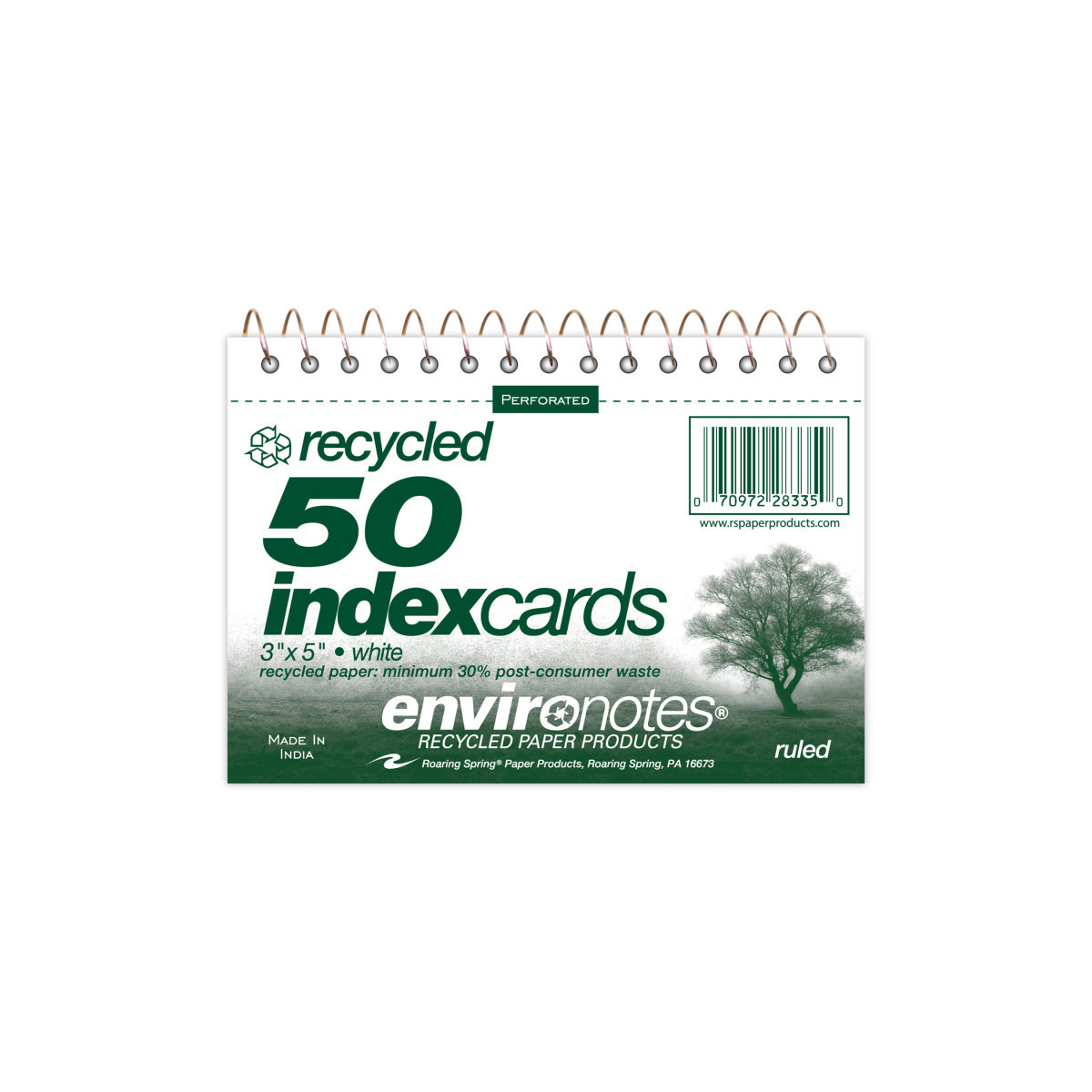 Wirebound Index Cards measure 5" x 3.5". Cards are produced with a minimum 30% PCW. Each card is ruled on one side and perforated for easy removal. Cards tear out to 5″ x 3″. There are 50 cards per book. Wire ends are coil-locked for snag-proof performance.